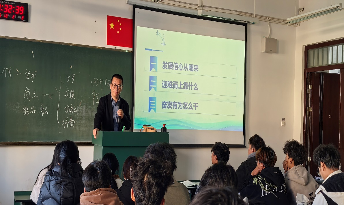 党委副书记李昆峰以“正确认识中国经济热点问题”为题,分别从经济基础与上层建筑的关系、国际博弈的实质、历史镜鉴、现实挑战与应对以及国内发展根本目标等多个维度进行讲解。引导学生认清中国和平发展道路的定力与智慧,阐明科技自立自强与供应链安全的战略意义。不仅厘清了热点背后的逻辑,更激发了学生投身国家发展的责任感,为其成长为担当民族复兴大任的时代新人提供了思想指引。