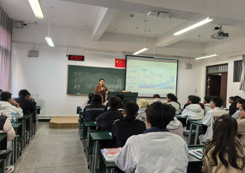 党委副书记、校长陈颖以“决胜‘十四五’ 奋发向前行”为题,紧扣职业教育“德技并修”的育人目标。课程依托学校数字化思政教学资源,将“十四五”期间智能制造、能源电力领域的发展成就与专业核心能力培养相结合。陈校长以供配电技术升级、自动化生产线革新等行业突破为切入点,解读规划中“加快制造业转型升级”的战略意义,穿插云南能源公司、水利水电十四工程局等实训基地的技术应用案例。课堂采用“理论讲解+虚拟仿真体验”模式,通过数字马院VR资源展示电气自动化技术在绿色能源建设中的实践成果,组织学生围绕“技能赋能高质量发展”展开研讨。课程既强化了学生对PLC应用技术、工业网络组态等专业知识的价值认同,又引导学生将个人职业发展融入“十四五”产业升级浪潮,激发了投身装备制造、能源建设领域的奋斗热情。