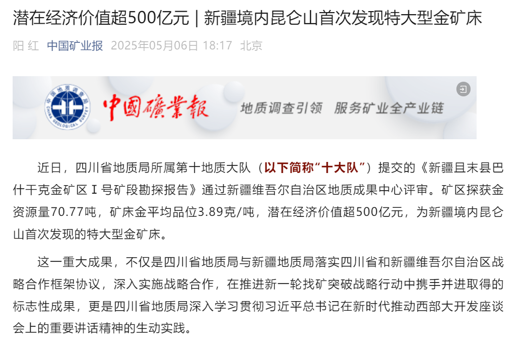 2025年4月,地调专业2010届毕业生谭渭源作为项目负责人提交的《新疆且末县巴什干克金矿区Ⅰ号矿段勘探报告》成功通过评审,潜在经济价值超过500亿元,成为新疆昆仑山地区首个特大型金矿,被《中国矿业报》(2025年5月6日)等行业权威媒体广泛报道。